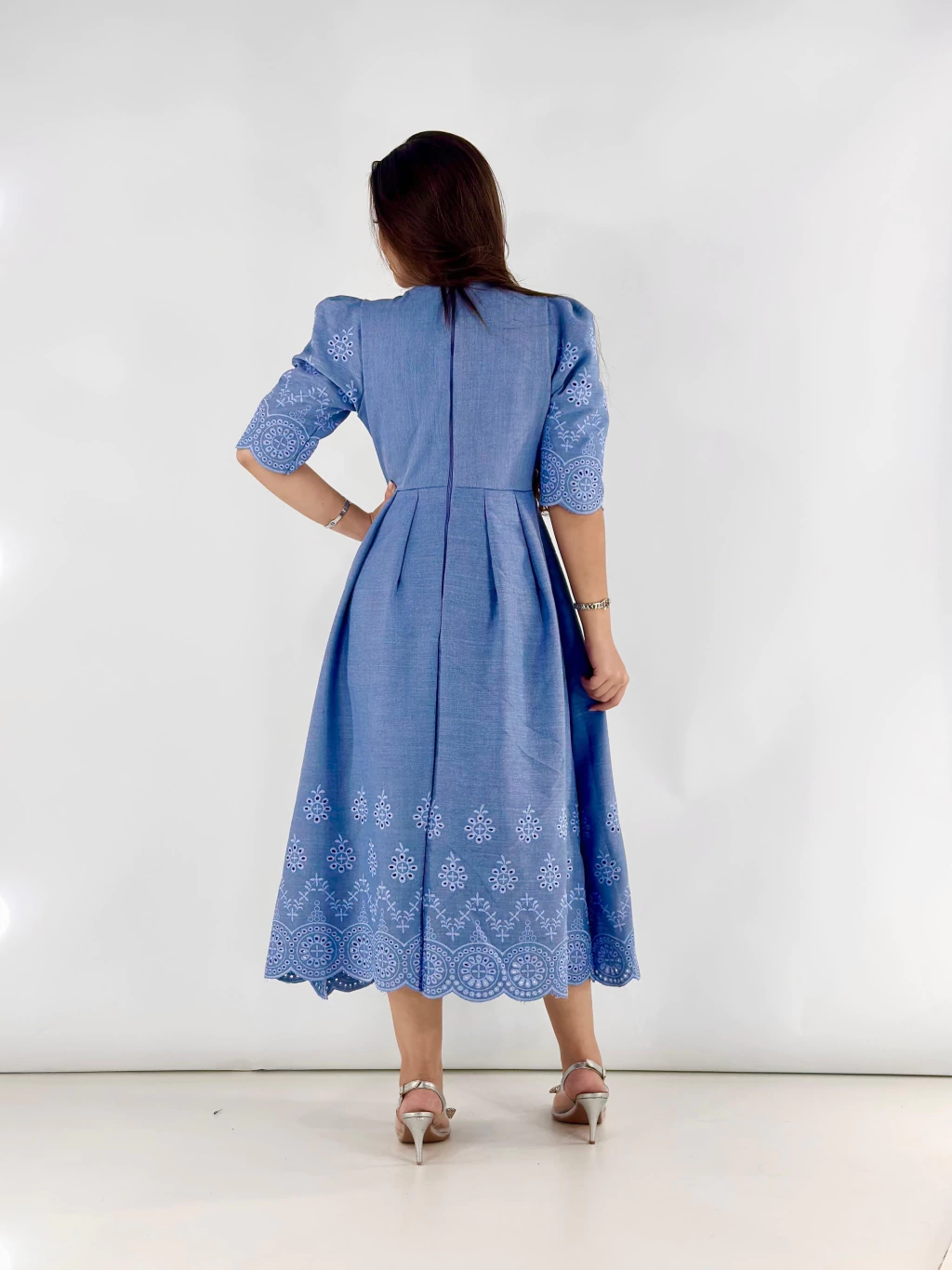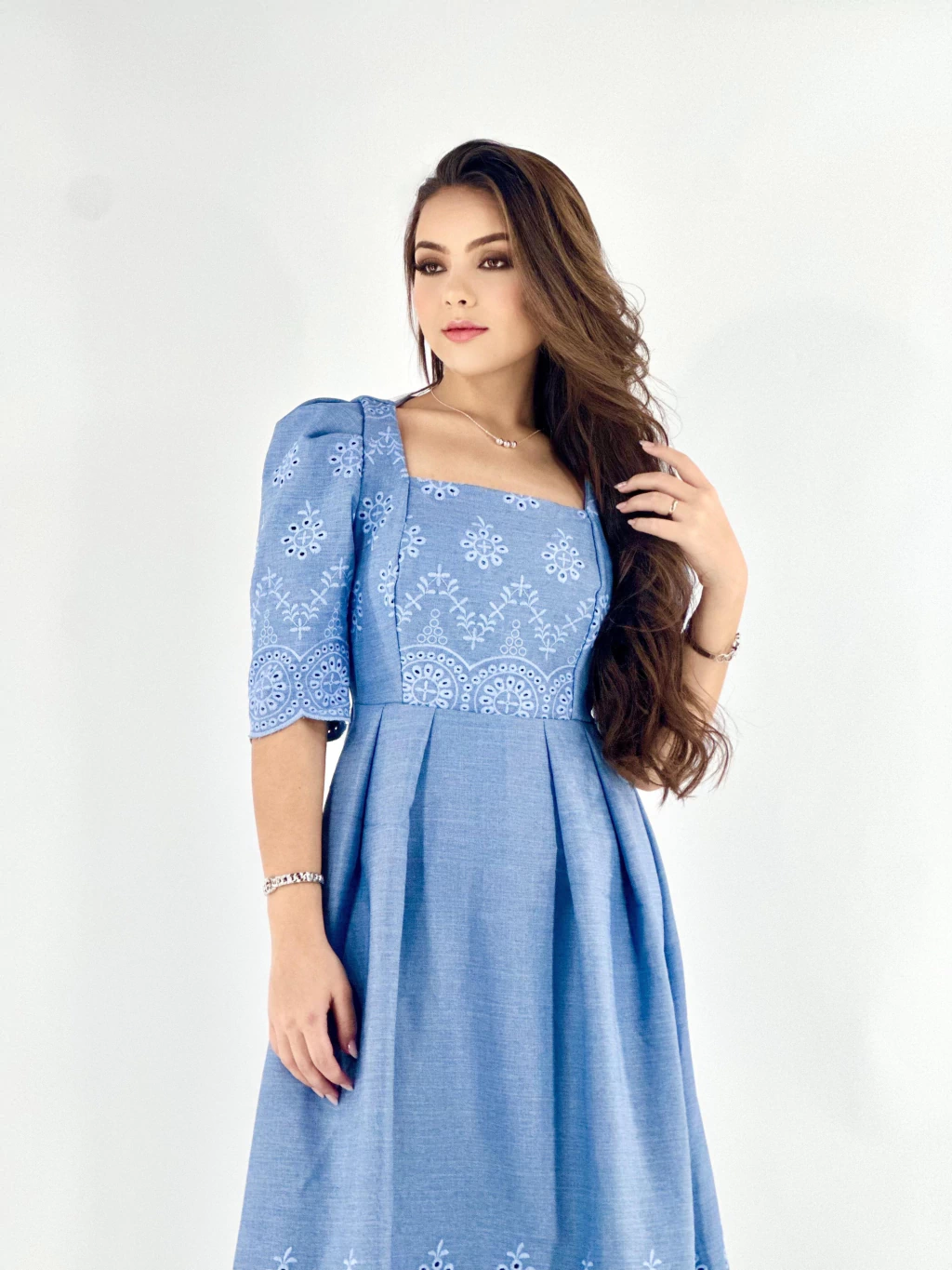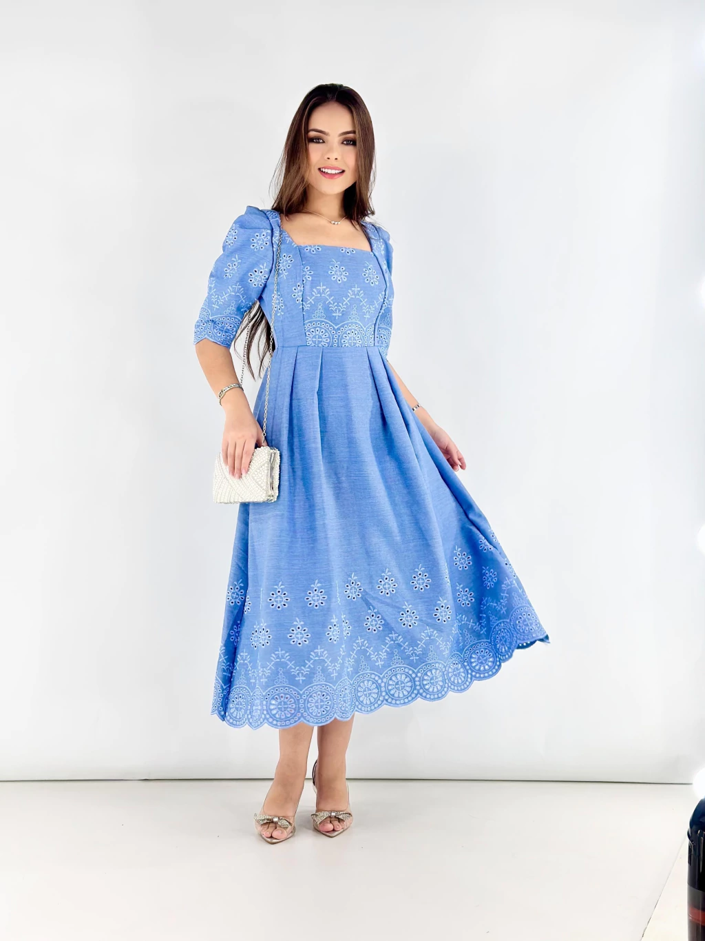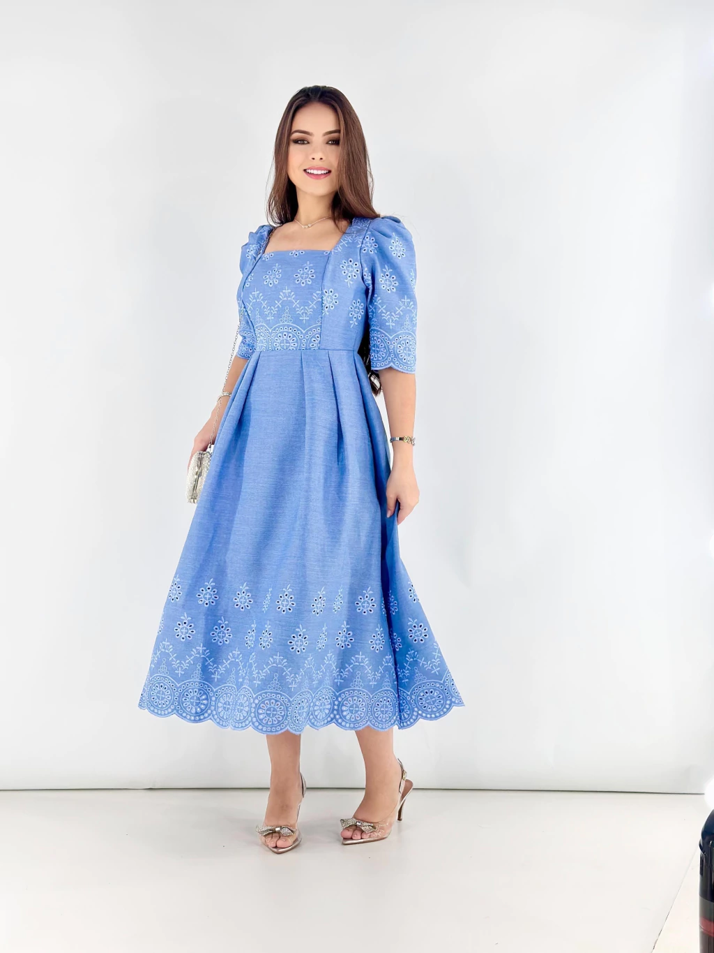 Confeccionado em jeans de alta qualidade, o vestido proporciona durabilidade e estilo casual, ideal para o dia a dia. Seu design midi equilibra modernidade e praticidade, tornando-o perfeito para diversas ocasiões.